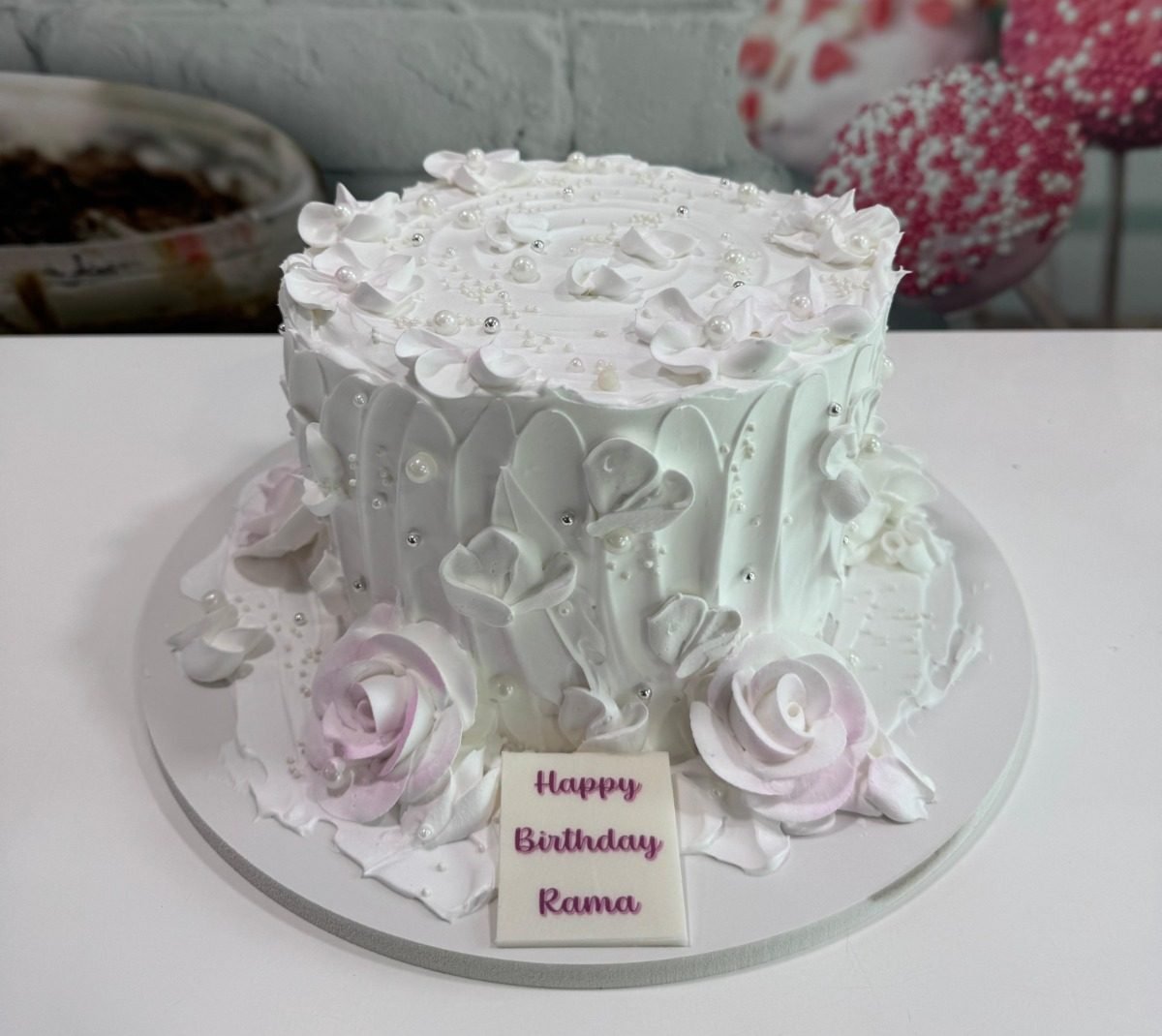 A round, romantic cake finished in white whipped with a lovely textured, petal-swirl effect. It is decorated with delicate piped roses in white and soft pink, accented with edible silver pearls and a small plaque with a message