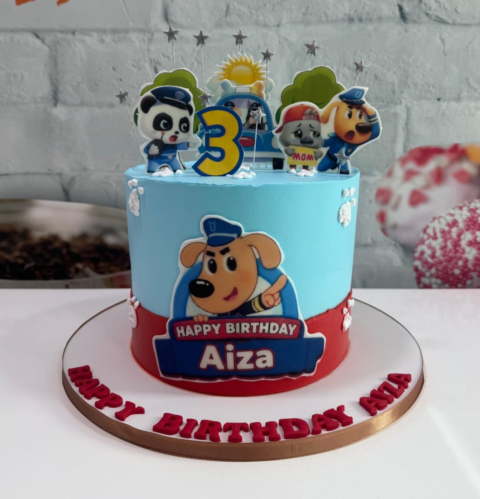 A bright blue and red themed cake adorned with cute cartoon animal characters and a large yellow “3” and the name.
