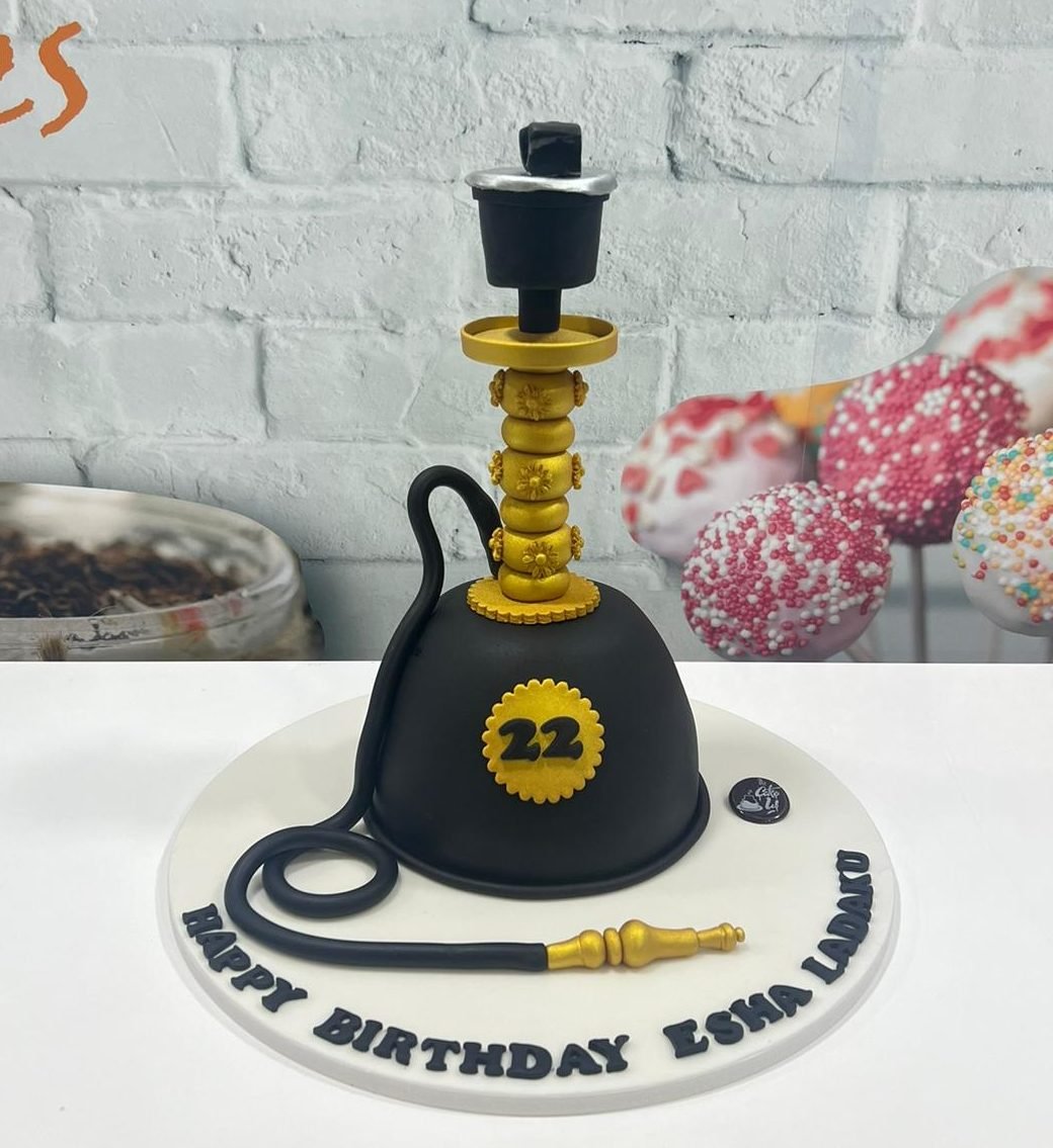 A highly detailed novelty cake sculpted and decorated to resemble a hookah or shisha pipe. The base is smooth black fondant with gold accents and a coiled black hose with a gold tip. The design features a stylized number ’22’ on the base, making it a unique and personalized cake for a young adult celebration.