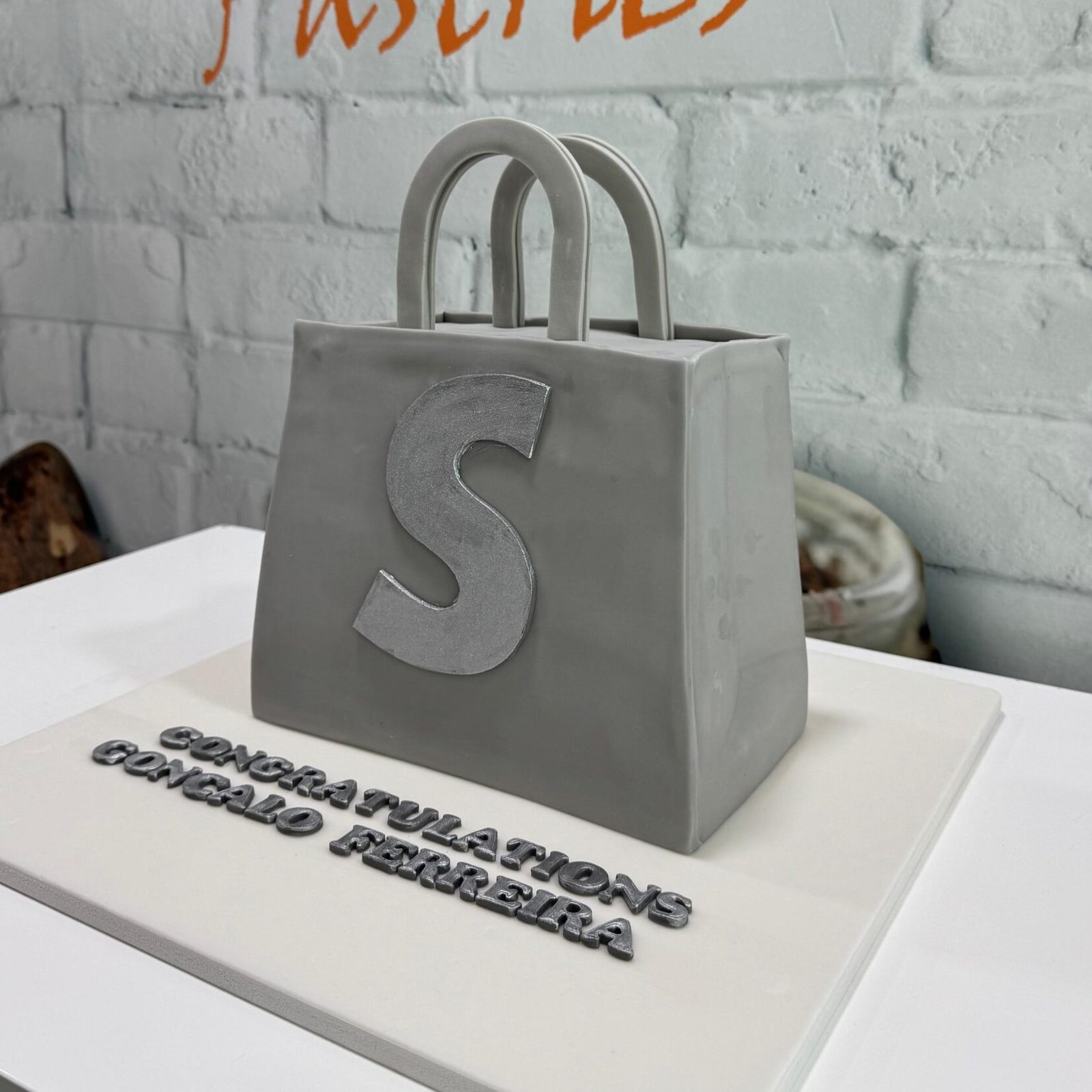 A sleek, grey designer bag-shaped cake with silver detailing, ideal for a stylish milestone or congratulations gift.