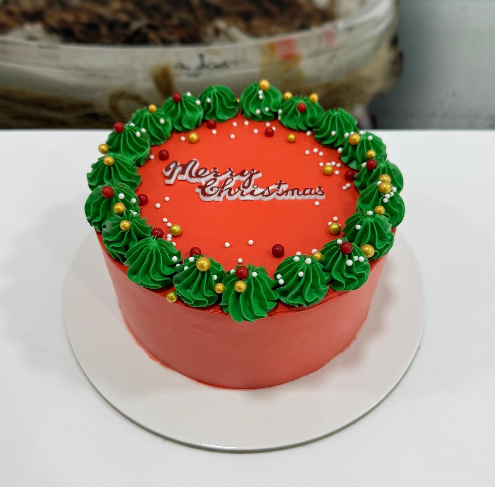 A vibrant red cake with a perfectly piped green buttercream wreath and festive sprinkles. Simple, joyful holiday cheer.