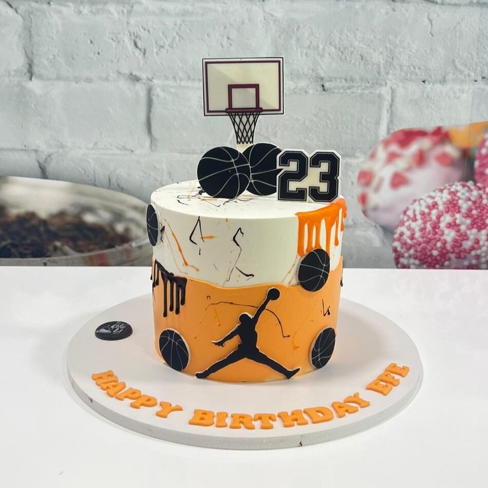 Perfect for the MVP. This dynamic cake features an orange and white “splatter” effect with black basketball silhouettes, a “Jumpman” logo, and a 3D basketball hoop topper. Personalized with the number “23” and a birthday message.