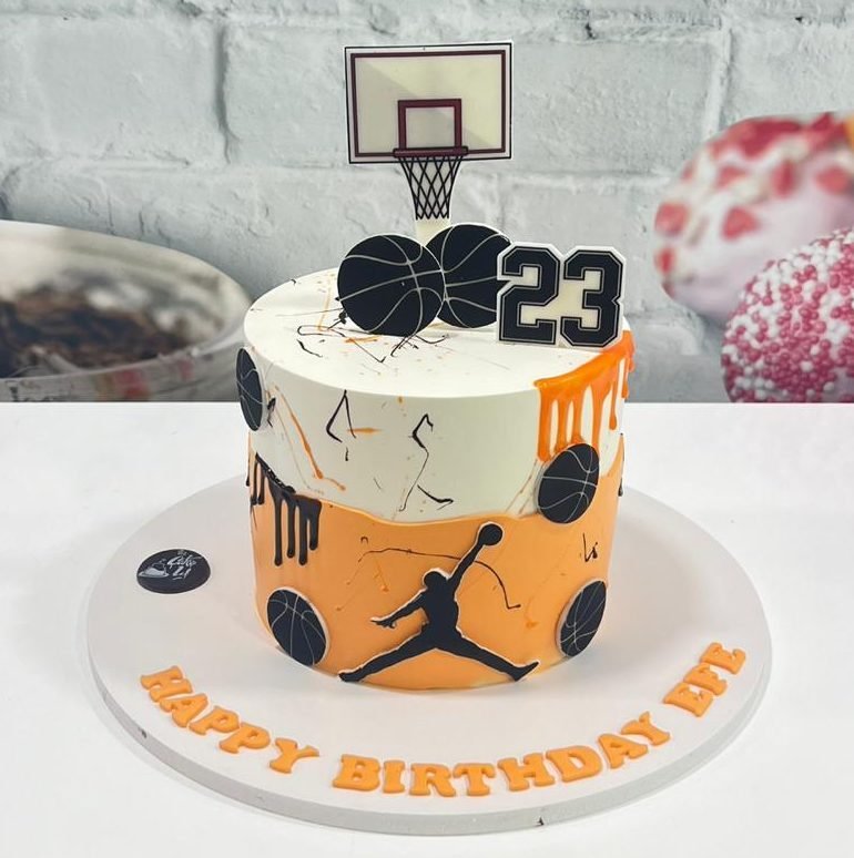 Channel your inner MVP with this Air Jordan-inspired design, featuring basketball silhouettes, an orange drip, and a hoop topper for the ultimate sports fan.