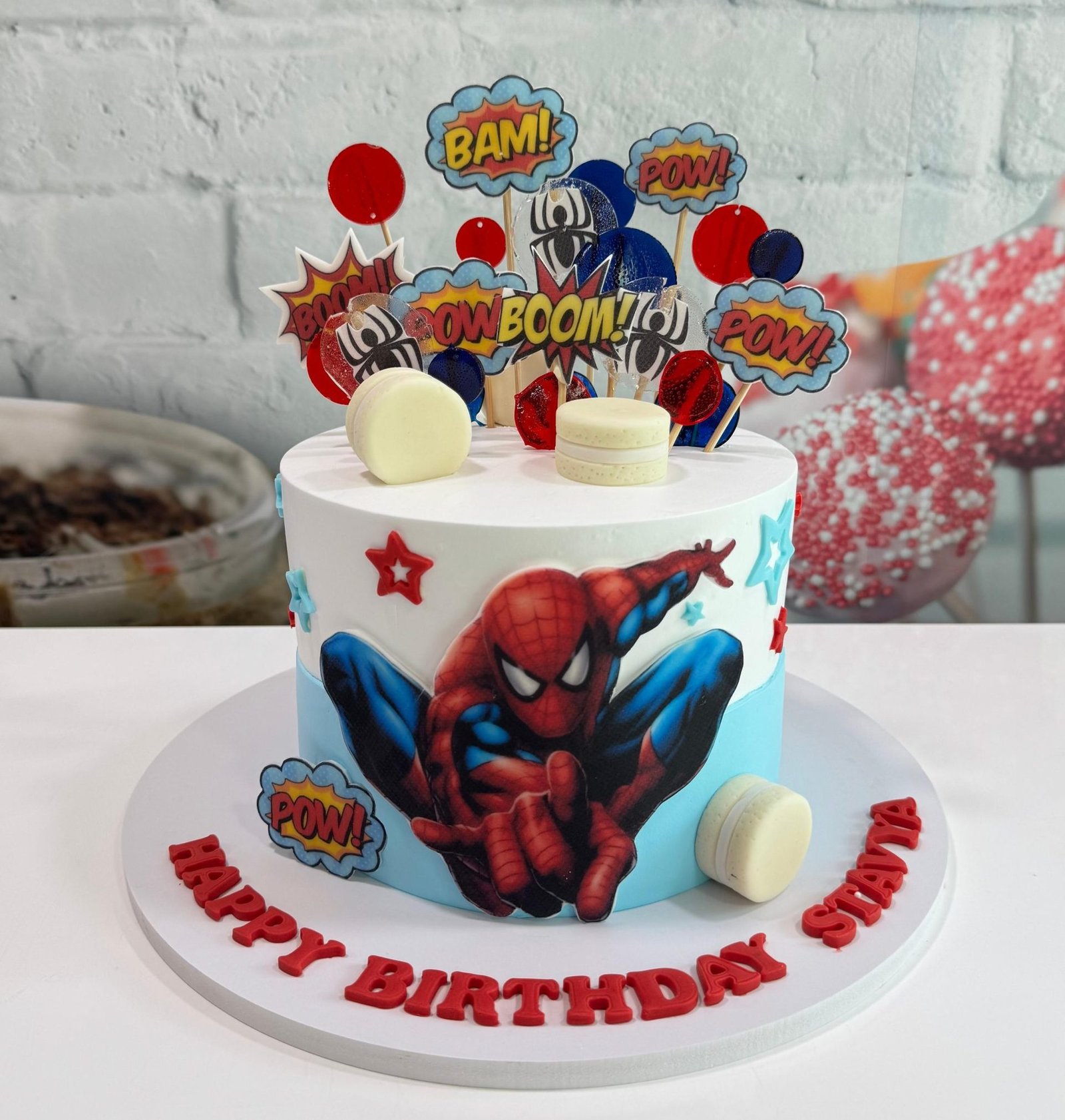 A dynamic white and blue cake featuring a bold Spider-Man image and iconic comic book “BAM!” and “POW!” toppers. A super choice for any superhero fan’s celebration.