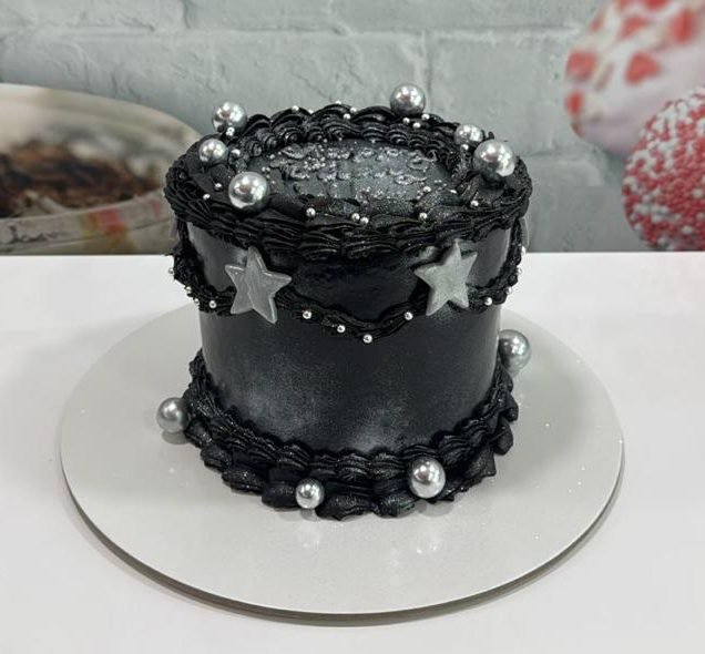 A dramatic, midnight-black cake featuring deep-grooved textures and a dusting of silver shimmer. Topped with metallic silver stars and pearls, it’s a perfect choice for a celestial-themed event or a chic evening party.
