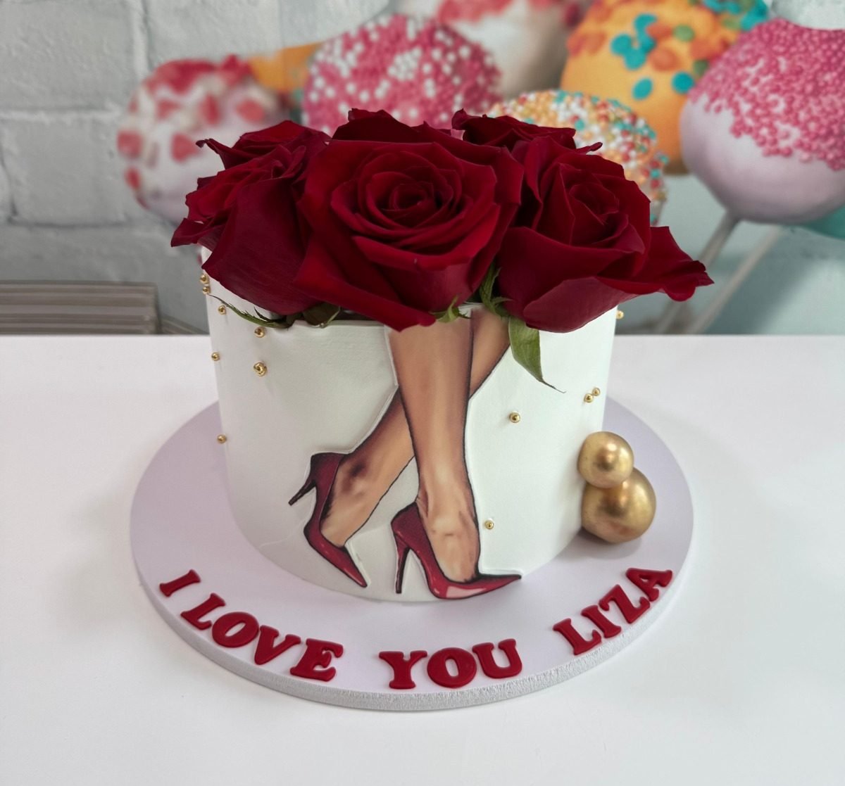 A gorgeous, romantic cake with an adult, stylish flair. The top is crowned with a striking bouquet of fresh red roses. The white cake features an edible image of legs in red high heels. The loving message is prominently displayed on the board.