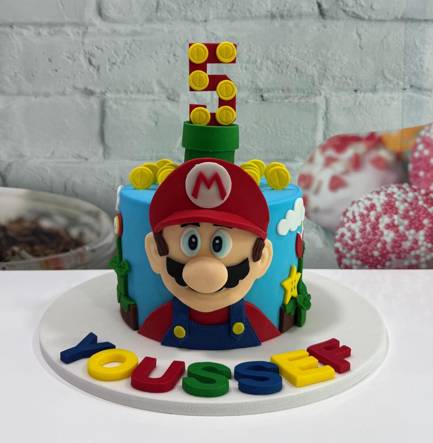Level up the party with this bright blue Mario-themed cake, complete with gold coins, clouds, and a custom Lego-style age topper.