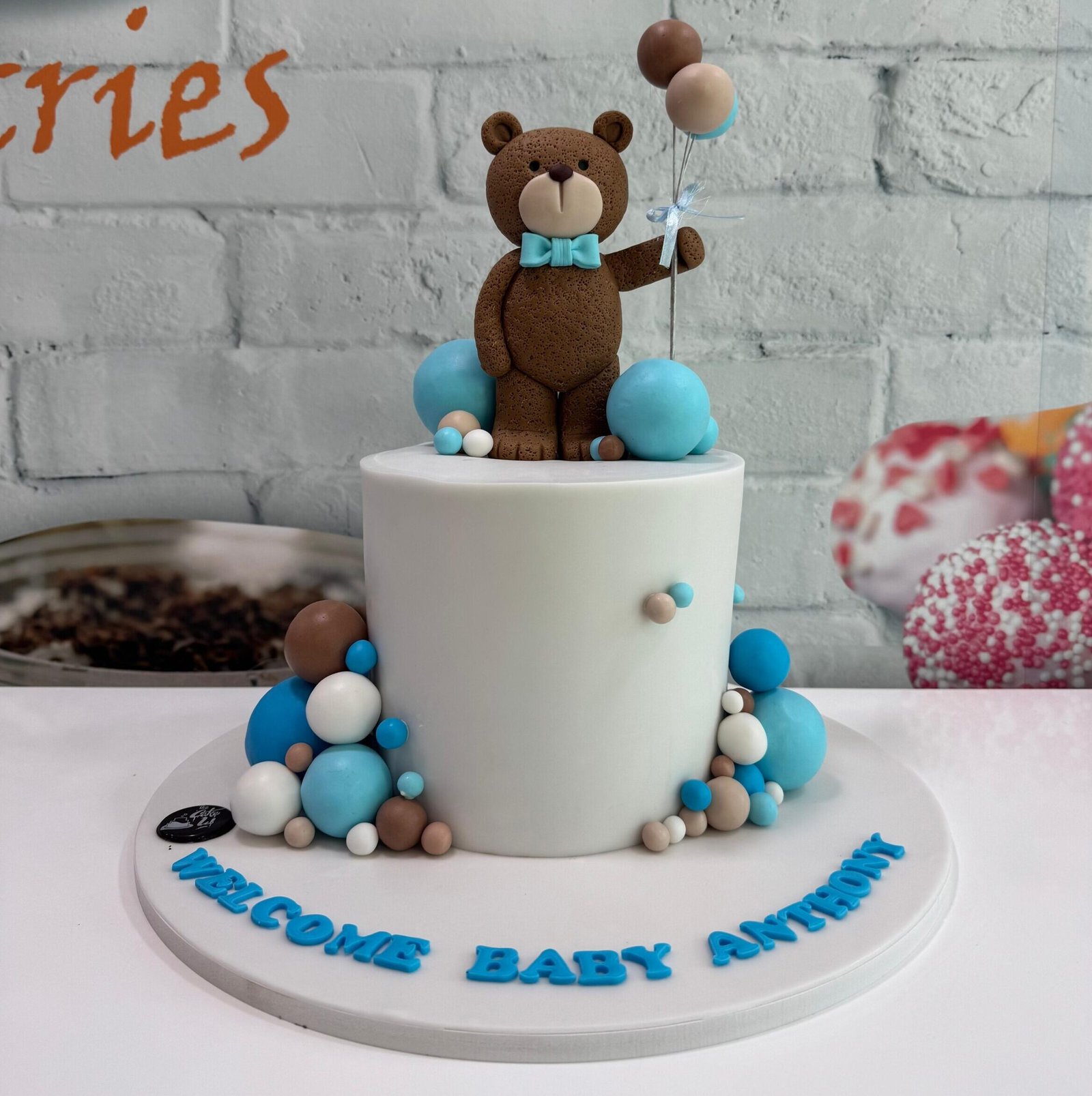 A charming white cake topped with a handcrafted brown teddy bear and blue balloons—perfect for a baby shower or “Welcome” celebration.