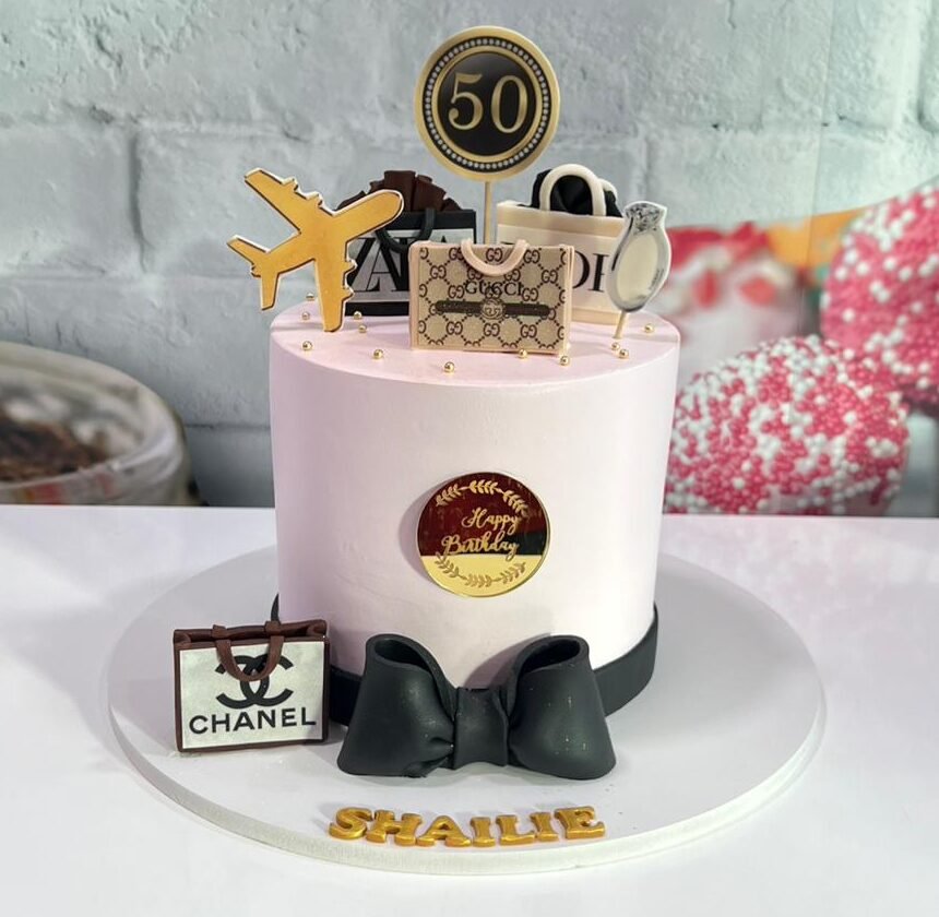 For the fashion-forward and the frequent flyer. This elegant blush pink cake is adorned with luxury brand shopping bags (Gucci, Chanel, Zara), a golden airplane, and a sparkling diamond ring, celebrating a milestone 50th birthday in style.
