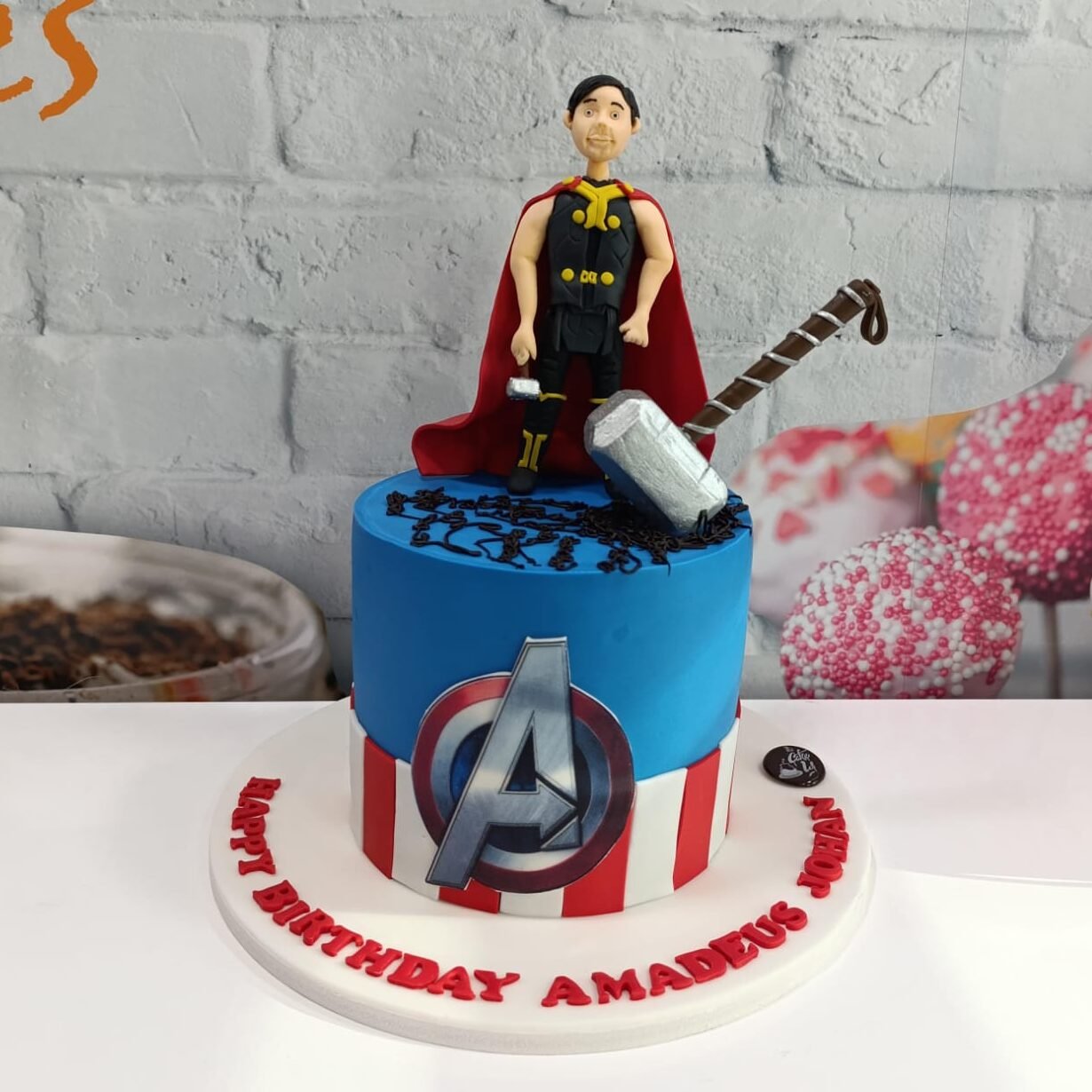 Assemble the ultimate party with this Avengers-themed cake. The design features a bold blue tier with the iconic Captain America shield and “A” logo, topped with a custom figurine in a Thor-inspired outfit holding Mjolnir. A fantastic centerpiece for any Marvel enthusiast’s birthday.