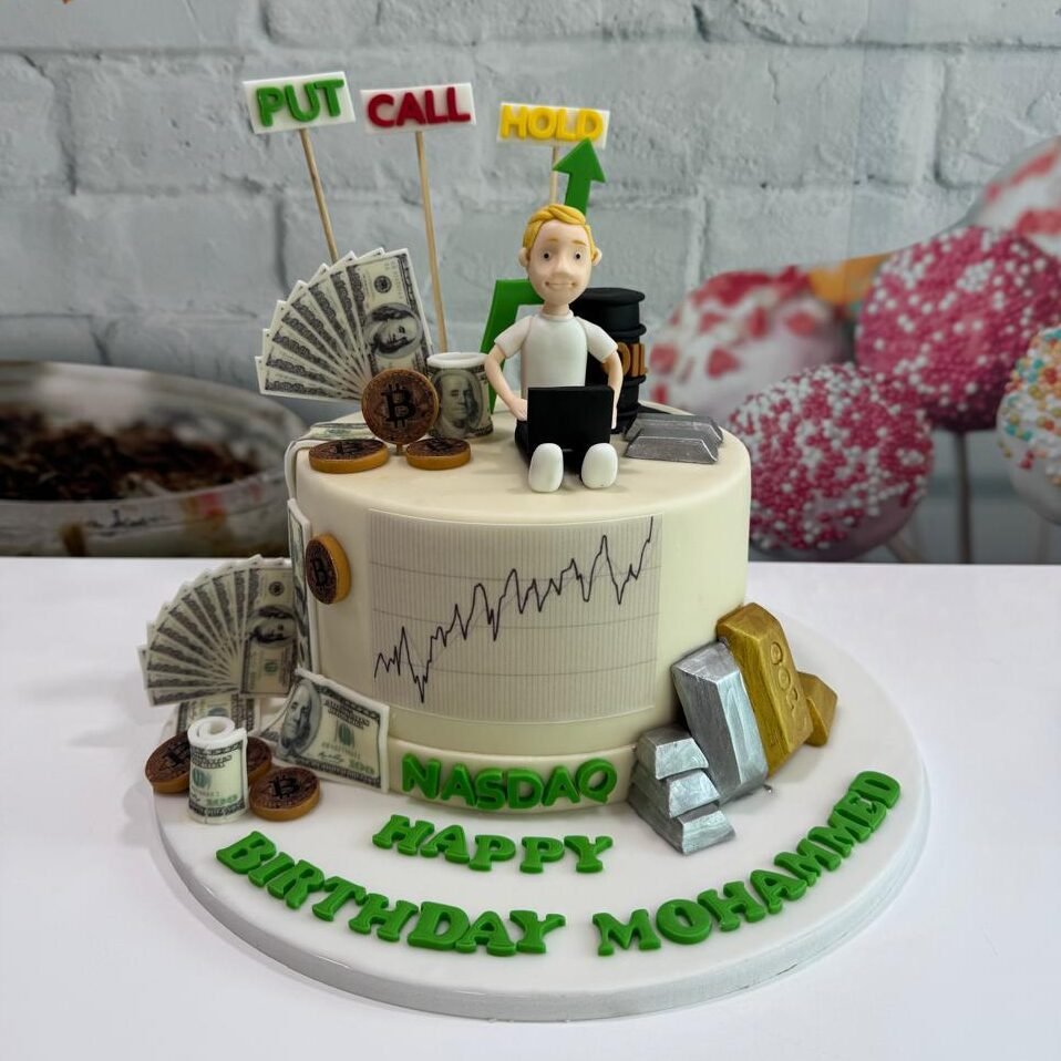 An intricate “Nasdaq” themed cake for the birthday guy, featuring a trader at his laptop surrounded by edible gold bars, silver bullion, Bitcoin, and cash.