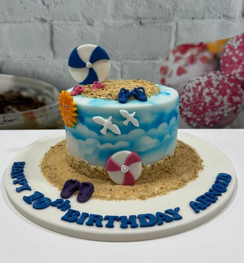 This fun, creative cake features a smooth buttercream finish airbrushed with a soft blue cloud-and-sky gradient. The top is covered in a “sand” made from crushed biscuits, decorated with tiny, hand-modeled beach accessories like flip-flops, beach balls, and seagulls, perfect for a summer birthday.
