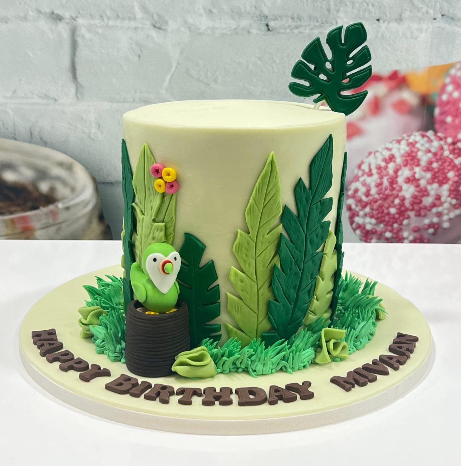 A charming, pale-green cake wrapped in large green jungle leaves, featuring a cute fondant parrot perched on a barrel. Ideal for jungle-themed parties or bird lovers.