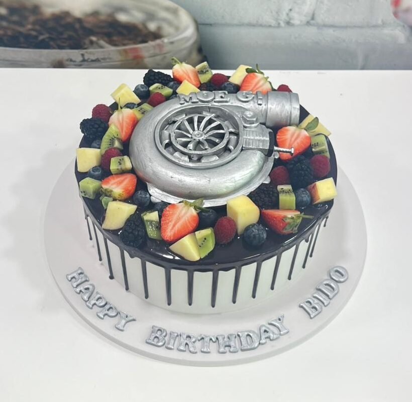 Rev up the celebrations with this high-performance masterpiece. Featuring a meticulously crafted silver turbocharger centerpiece, this cake is surrounded by a vibrant rim of fresh strawberries, blueberries, kiwi, and blackberries. Finished with a sleek chocolate drip, it’s the ultimate choice for the car enthusiast who appreciates both speed and flavor.