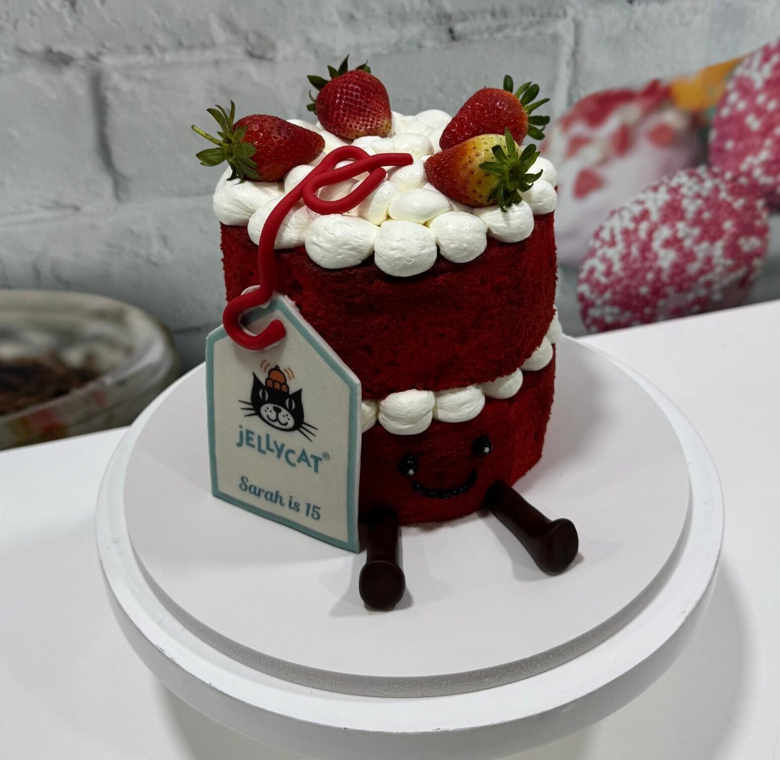 A whimsical red velvet cake inspired by iconic plush toys, featuring a smiling face, chocolate legs, fresh strawberry toppers, and a signature product tag.