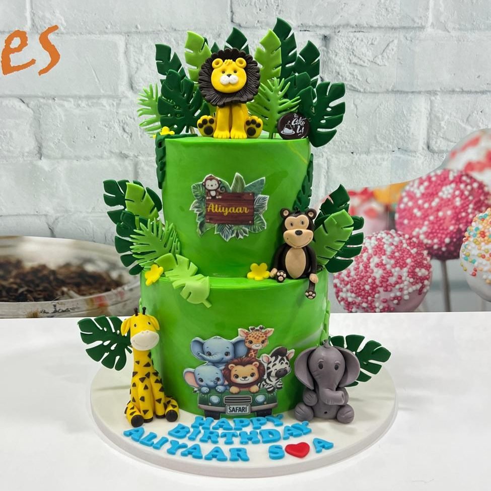 This tall, two-tier cake uses a bright “jungle green” fondant base. The top is crowned with a hand-sculpted lion sitting among a dense forest of upright fondant palm leaves. The design features a layered storytelling approach, with a 2D safari vehicle decal on the front and 3D monkeys and giraffes climbing the sides, creating a full 360-degree visual experience.