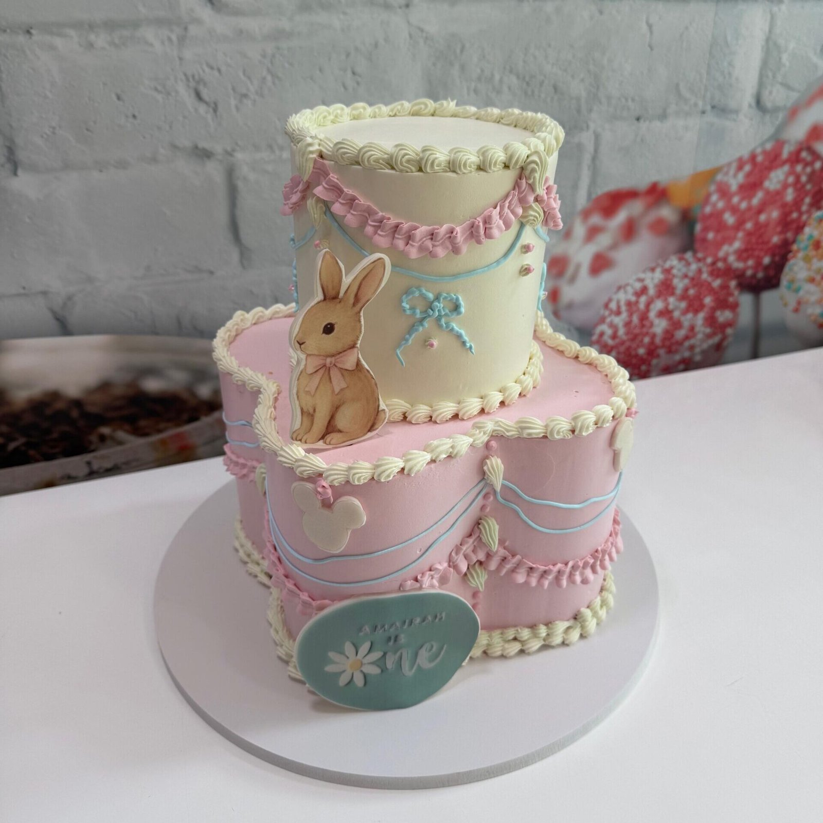 A whimsical 1st birthday masterpiece. This tiered design features vintage-style “coquette” piping, delicate blue bows, and a charming storybook bunny. Perfect for a soft, pastel-themed nursery celebration.