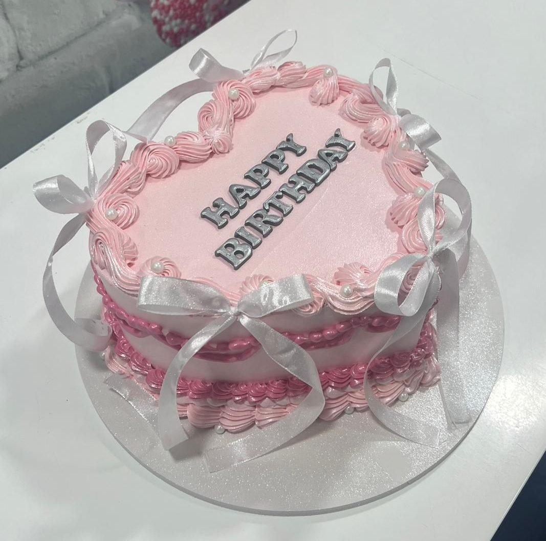 Embrace the “coquette” trend with this heart-shaped cake, featuring intricate vintage-style piping and delicate white satin ribbons.