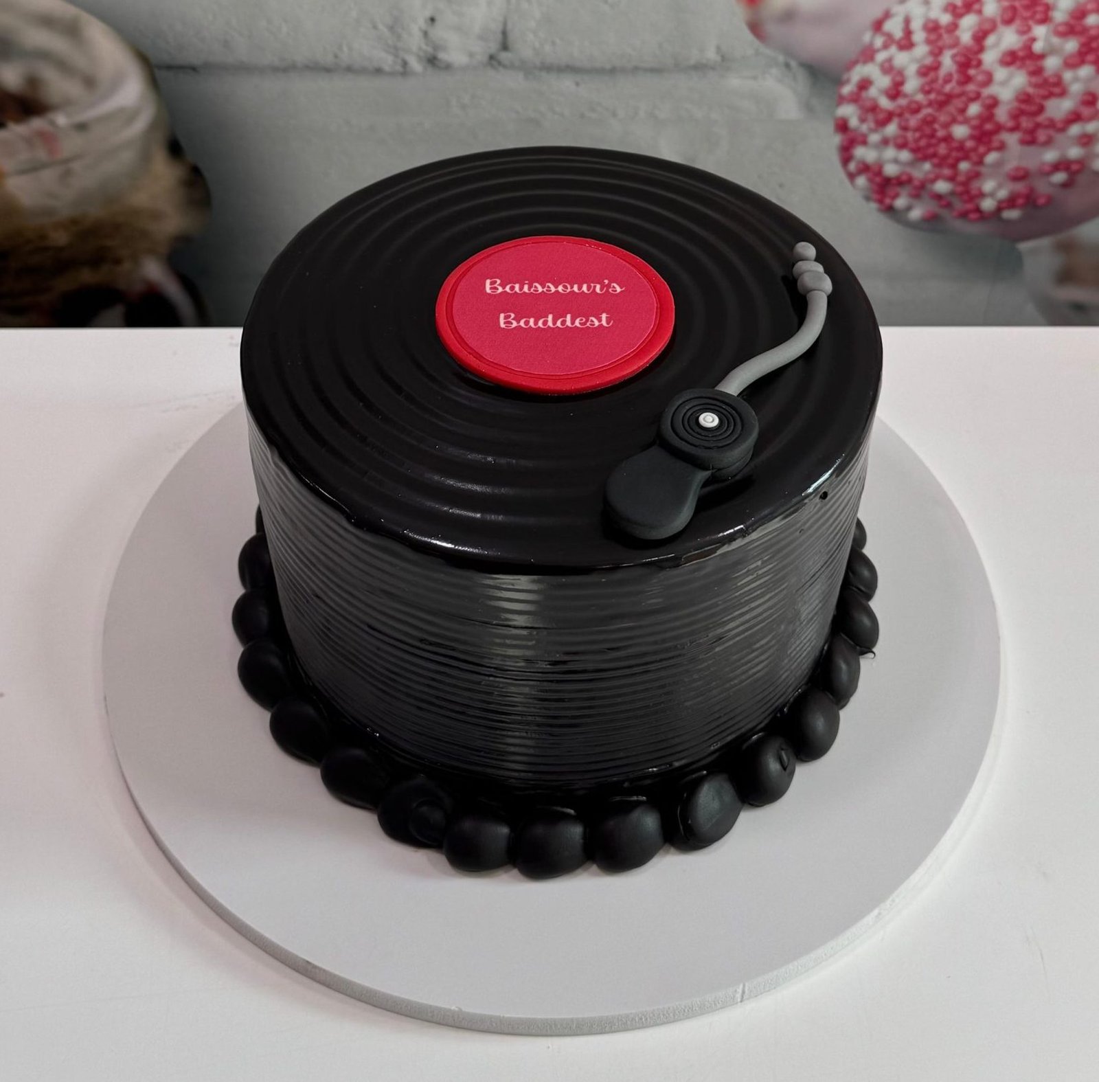 A smooth, black cake designed to look like a vintage vinyl record on a turntable. Perfect for the music lover or DJ.
