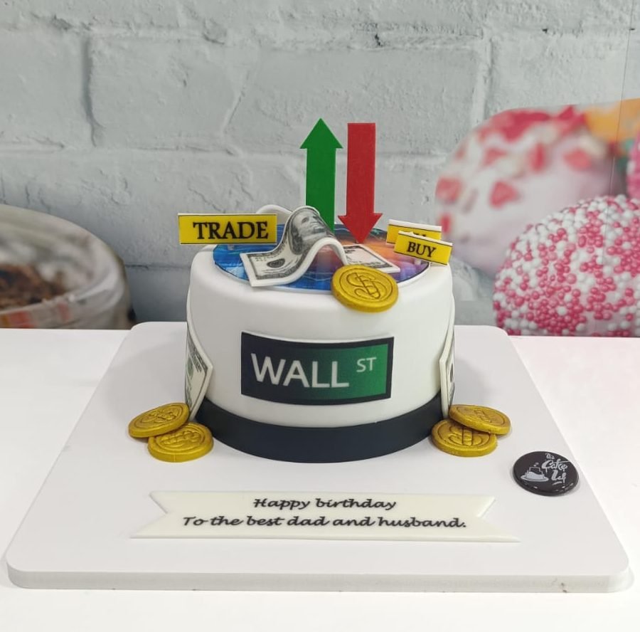 A minimalist cake focusing on the Wall Street theme. The small white tier features a “WALL ST” street sign and is decorated with golden coins, dollar bills, and large stock market arrow toppers. Perfect for a birthday/Father’s Day, dedicated to “the best dad and husband.”