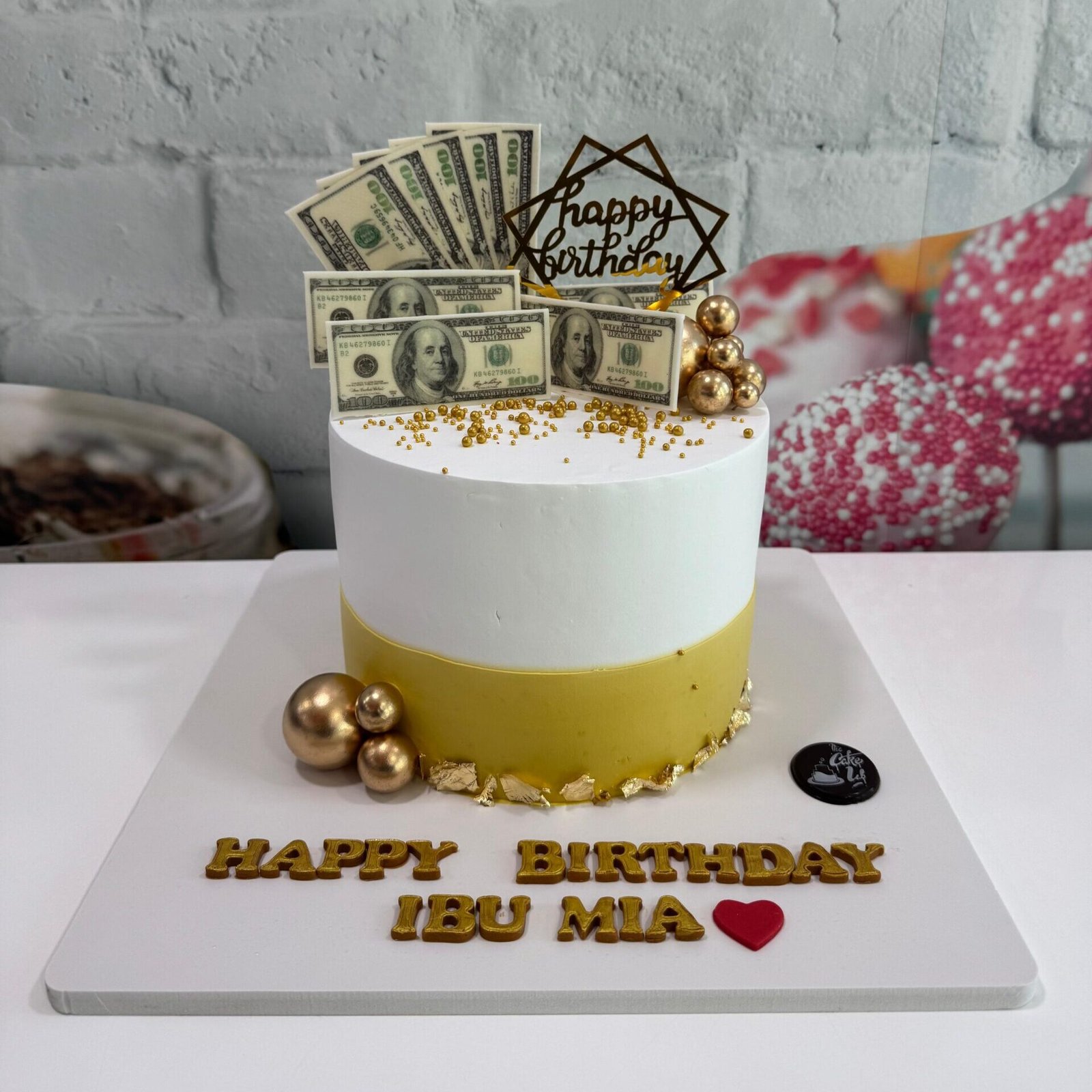 A sophisticated white and gold cake, Decorated with gold leaf accents, metallic spheres, and a fan of edible $100 bills, it’s a cake made for royalty.