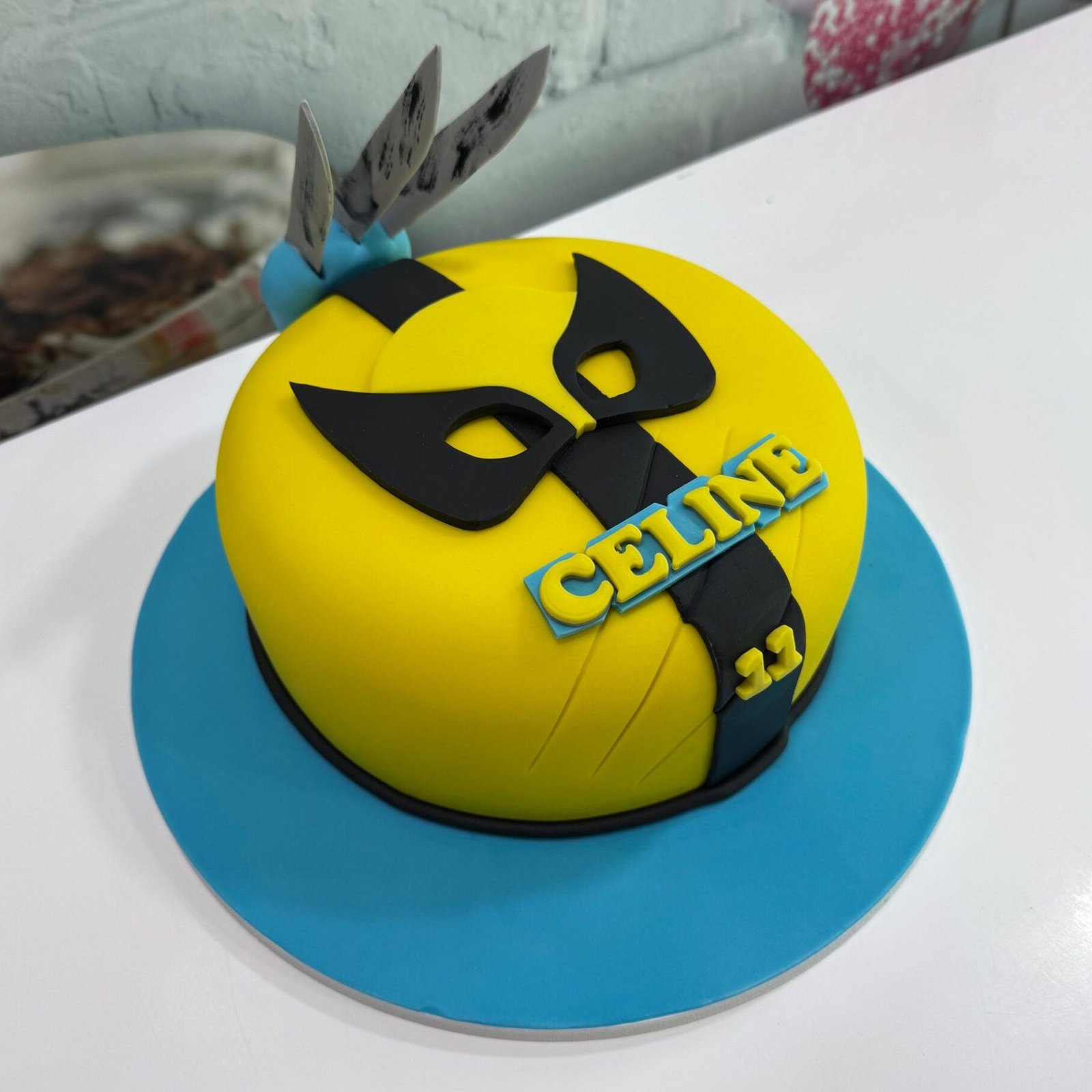 A bold yellow and black cake designed to look like a famous wolverine mask. It features metallic-looking claw toppers and custom blue lettering for the birthday.