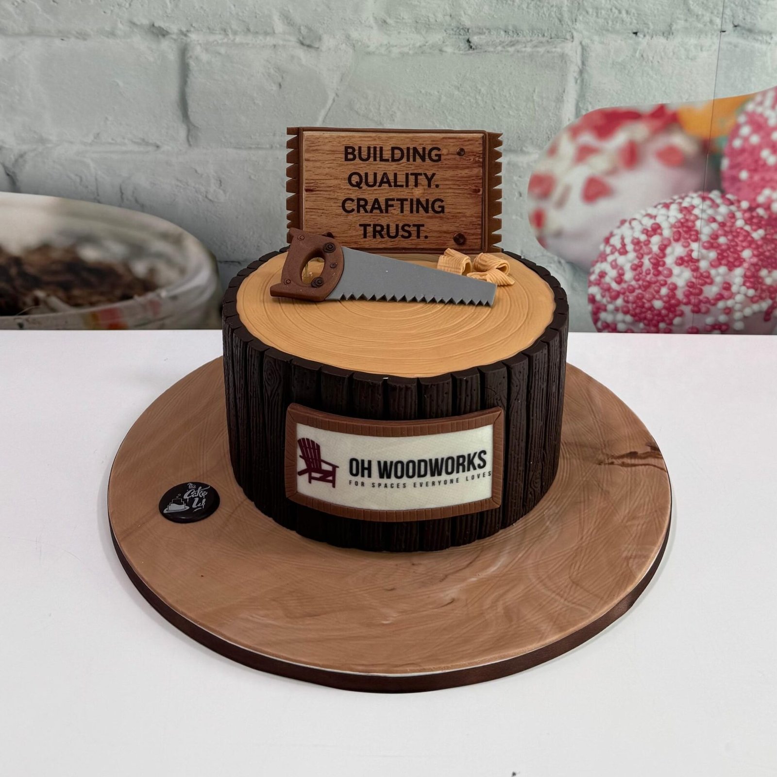 A highly detailed cake designed to look like a realistic tree stump with dark chocolate “bark” texture and a light wood-grain top. It features edible fondant tools, wood shavings, and custom corporate branding for a professional finish.